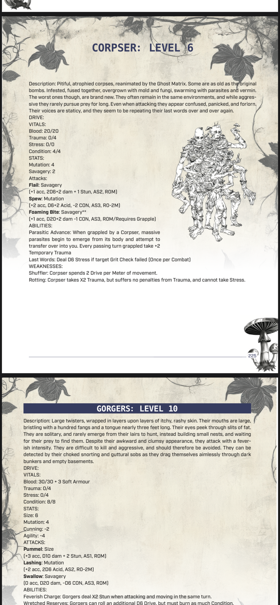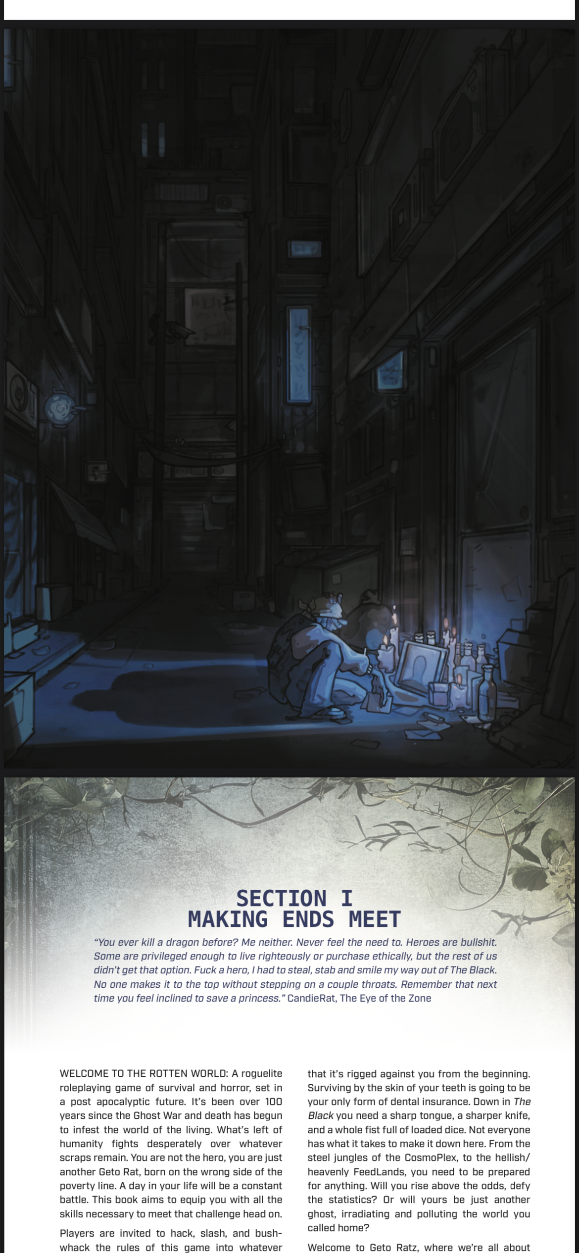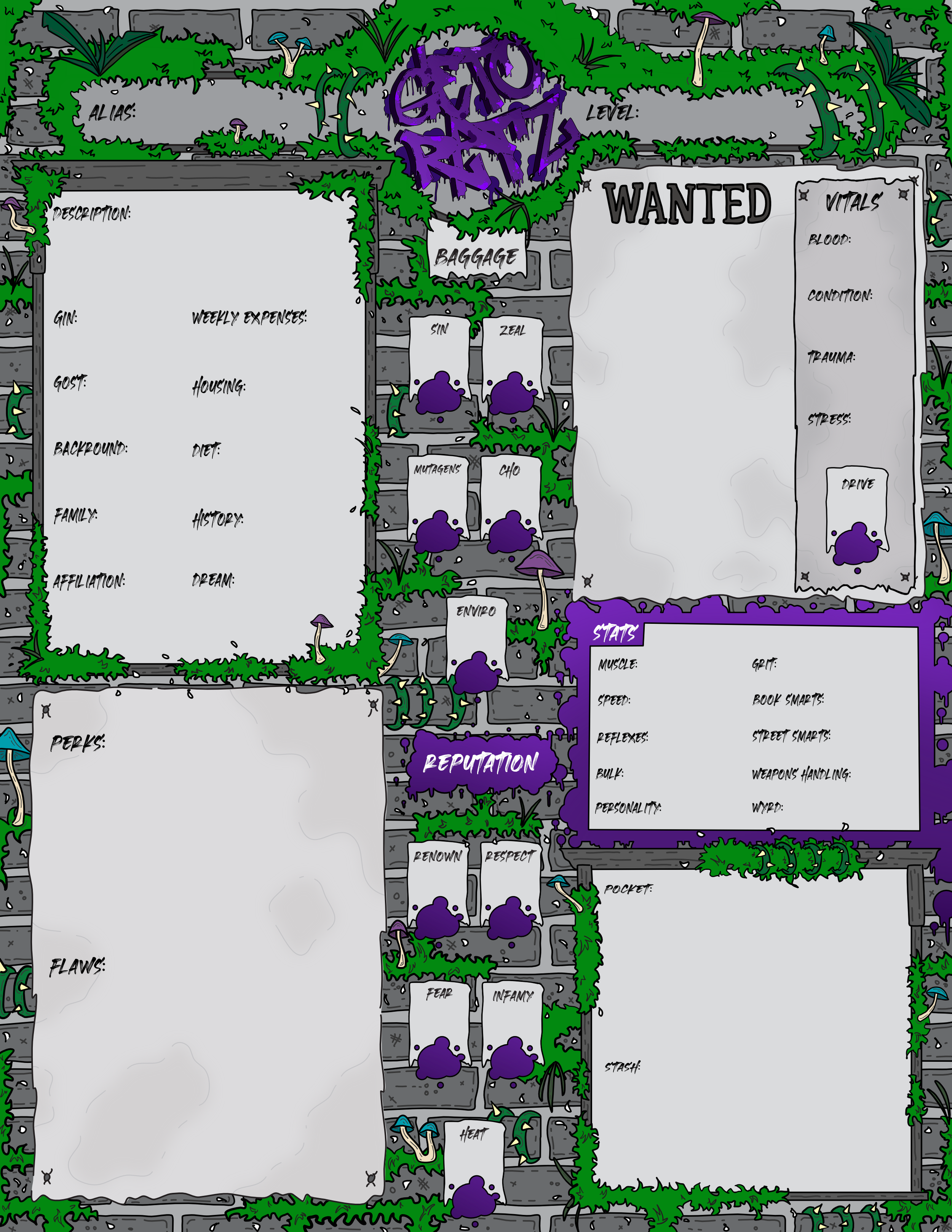 GETO RATZ is a tabletop RPG developed by Spider-Eyes ENT.CO. Struggle to survive in a cruel and chaotic bio-punk dystopia. Arm yourself with a wealth of unique weapons, body augmentations, vehicles, rites and malware. Scratch together fistfulls of cash with dozens of devious downtime activities. Fight back against a bestiary of monsters and madmen with a combat system designed for bloody, tactical, life-and-death action. Geto Ratz uses a roguelite character creation system. Flesh your character out with flaws, and spend sin to increase your stats, and purchase life saving perks. Most importantly, watch your back, because one knife is all it takes… Will your players realize their dreams? Or will they find themselves as just another handful of ghosts left to watch and wander their dying world?